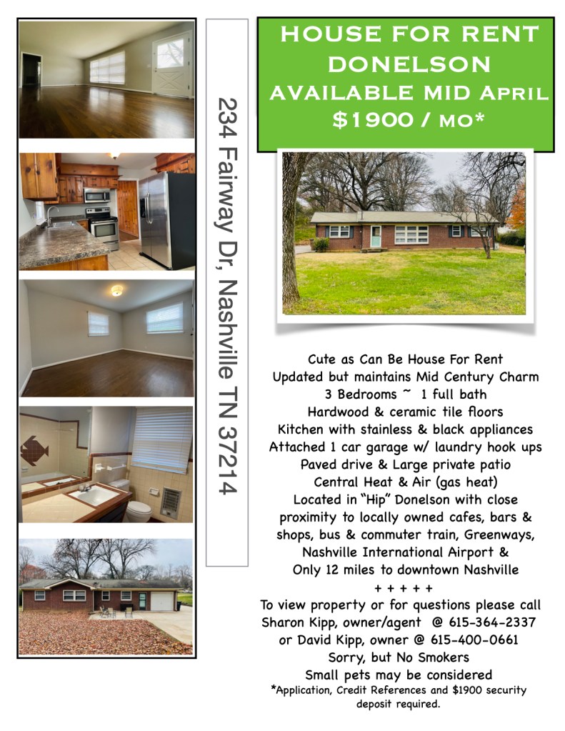 For more info, or to schedule a showing of the house, call or text Sharon Kipp @ 615-364-2337